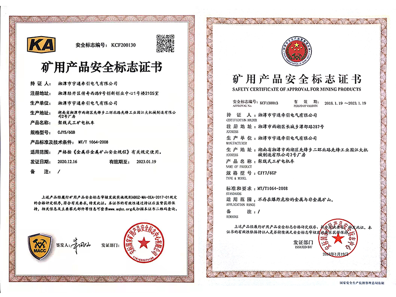 MA and Ka certifications of CJY5 & CJY7 Mining Trolley Locomotive